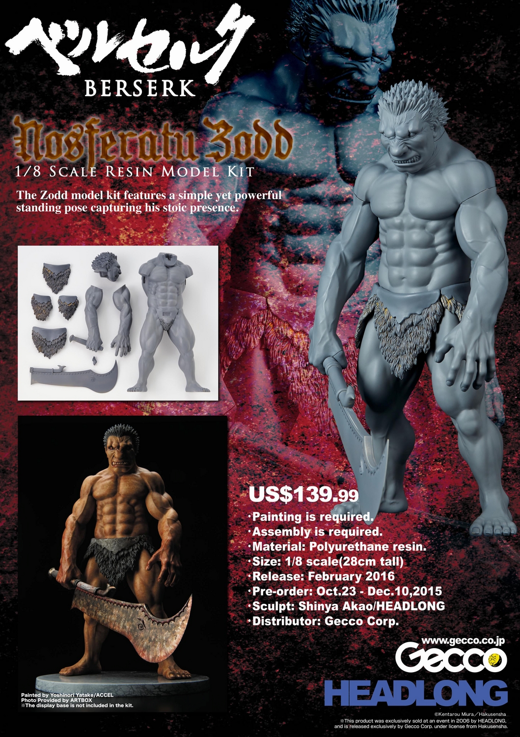 Gecco Corp. has announced that 1/8 scale resin model kits of the two big characters from Berserk, Guts & Zodd, will be joining their product lineup. Set to be released in February 2016, pre-orders are now open at Gecco's online store until December 10th, 2015.