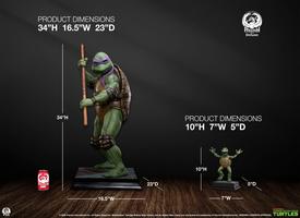 Standing an impressive 34” tall, the Donatello 1:2 statue is sculpted in incredible detail from the textured reptilian pattern of his skin to the realistic leather like appearance of his belt, knee and elbow pads. The sculpted details are made even more apparent by the excellent paint work throughout. Woodgrain finishes on Donatello’s bo staff and realistic glass eyes add additional depth to this piece and tie in nicely with the clean finish of the museum style base.